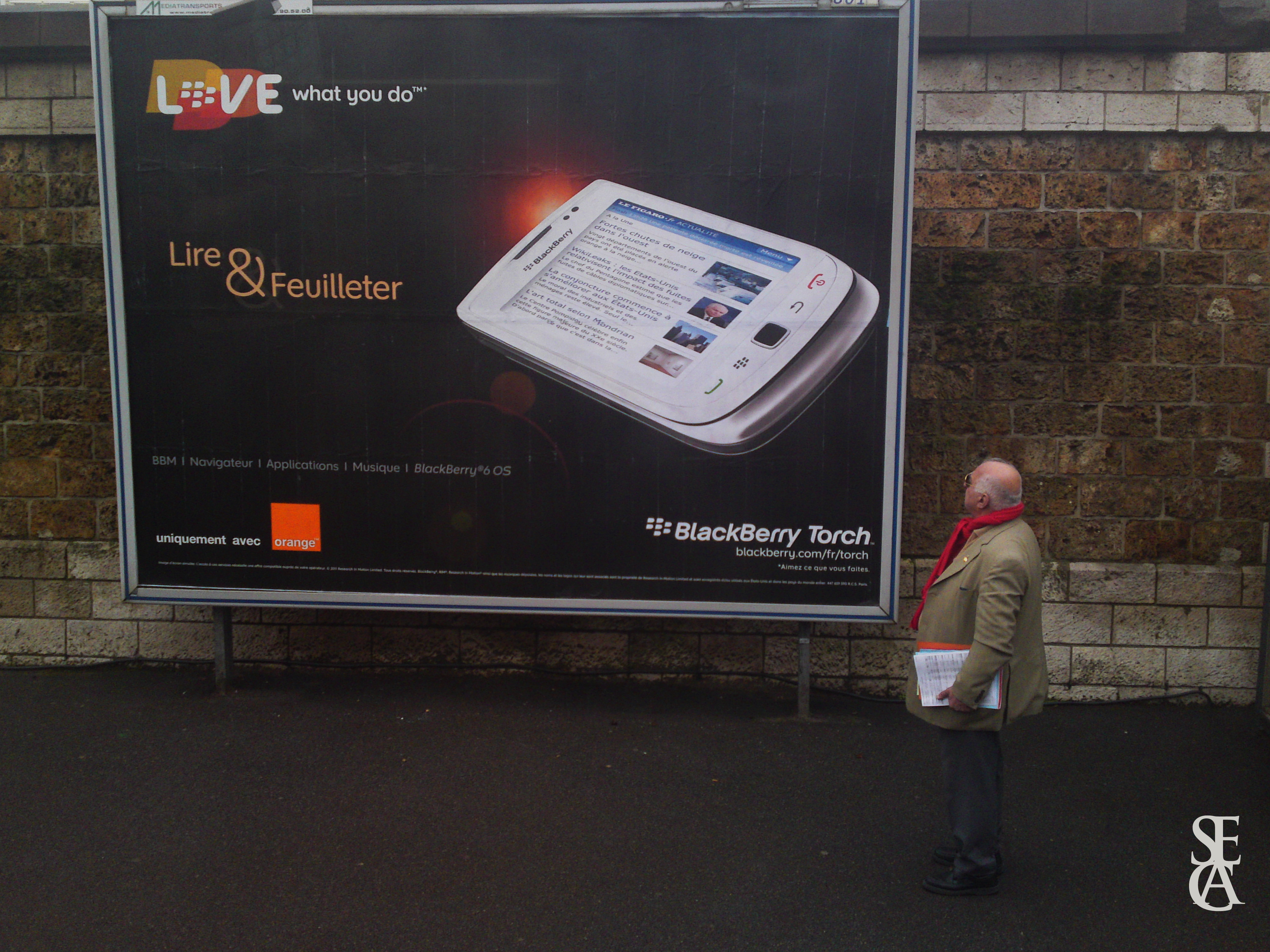 Le plus curieux dans l’approche d’un quotidien est la constante des contrastes. Il y a sur une ligne de « transports » tout pour faire réfléchir à un nouveau monde. Celui-là est imaginé par des astucieux marketeurs qui font de l’objet un support qui envahit le petit monde d’un monsieur à l’écharpe rouge qui tient encore quelques feuilles. Arrivera-t-il à contrer le flux XML qui va RSSiser son quotidien, sa vie, modéliser sa vision d’un monde ?