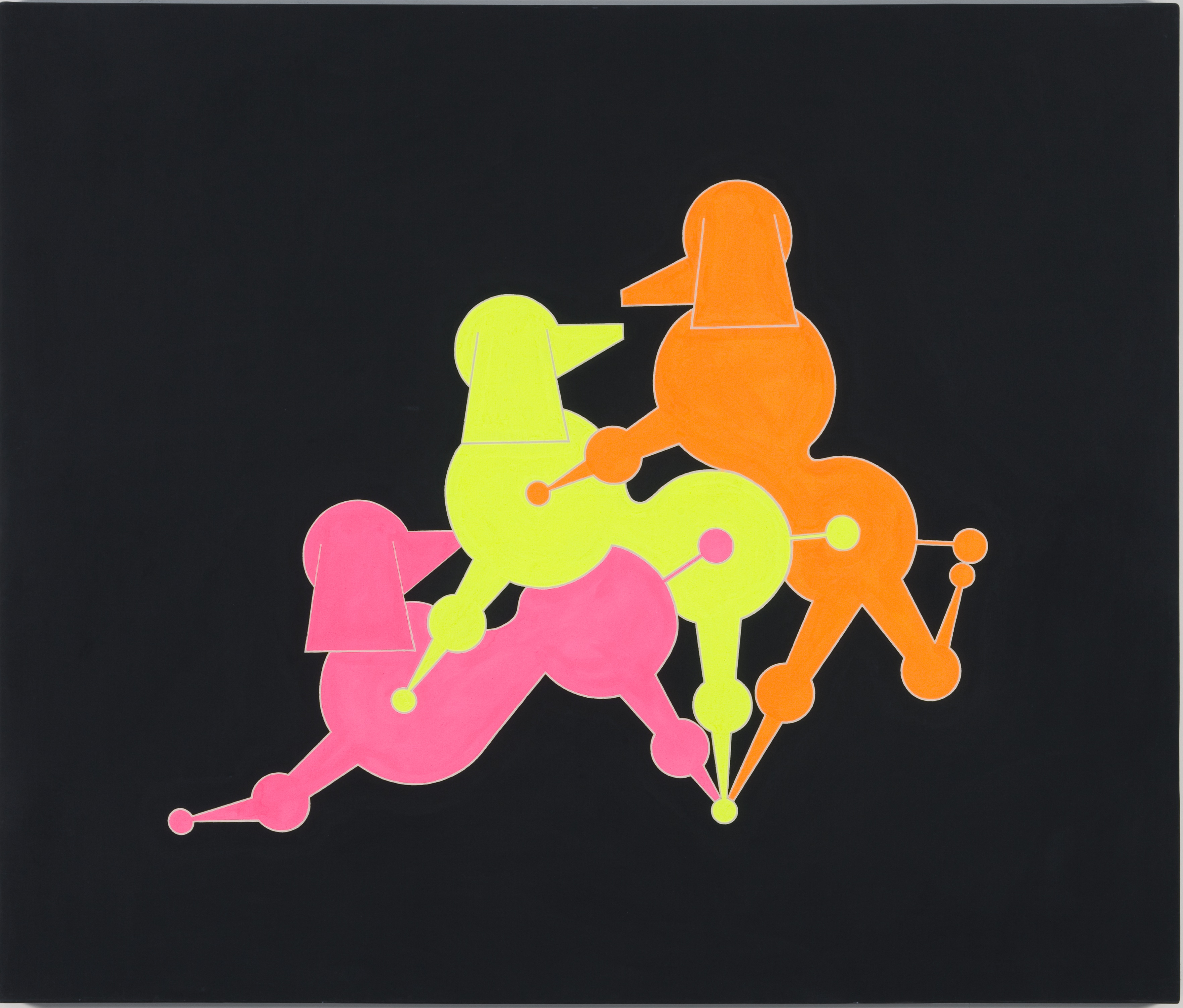 Puis avec la nouvelle phase Mondo Cane Kama Sutra, on assiste à une remise en question du pivot de la norme sociale, la cellule familiale et le patriarcat. Ce nouveau projet fait référence au documentaire de Paolo Cavara, dans lequel le travail d’Yves Klein avait été malheureusement tourné en dérision – ce que ne manqueront pas de refaire les trois compères avec le triptyque XXX bleu. General Idea vide de son sens cette représentation, pour l’investir de nouvelles significations. Tout en affirmant clairement l’homosexualité et le triolisme du groupe, il va plus loin en proposant de nouvelles configurations, comme Michel Journiac avec sa série Mère/Père/Amant/Amante dans « L’inceste ». D’une précision quasi mécanique, les caniches emboités schématisent dans la succession des combinaisons, les différents positionnements des individus dans un groupe : de la soumission à la glorification, en passant par la marchandisation et la standardisation, jusqu’au point G.I. !