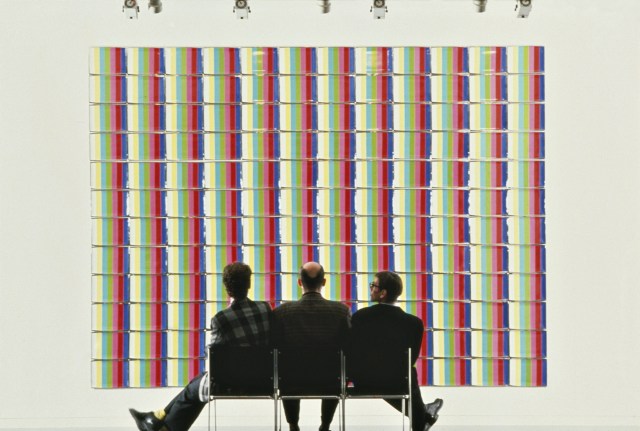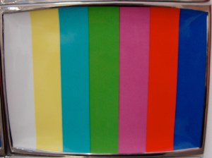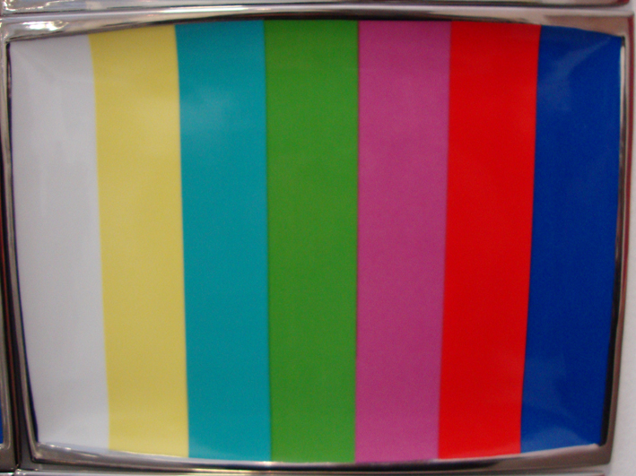 De la Presse à la Télévision, le collectif ne pouvait que s’intéresser à cet outil de formatage terriblement efficace, que le capitalisme occidental effréné était en train de glorifier. Après avoir plongé avec délices dans le processus de mystification avec Miss General Idea, il s’est naturellement intéressé à l’image de la TV comme icône du XXème siècle. Ainsi en 1988, à l’occasion d’une exposition au Centre d’Art de Tokyo, General Idea suggère une réflexion sur la peinture abstraite et le Pop Art, en recouvrant les murs de motifs rectangulaires, démultipliés à l’infini. Ce sont en fait des céramiques légèrement incurvées et imprimées d’une mire arc-en-ciel, telle une palette lumineuse pour des techno-peintres contemporains.