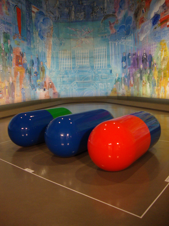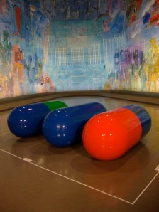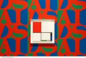 Le problème du Sida a complètement occupé General Idea à partir de 1987, puisque la maladie a concrètement affecté le collectif, en prenant la vie de deux des trois membres en 1994. Leur œuvre « AIDS » est inspirée de celle très célèbre, et déjà déclinée en nombreux dérivés commerciaux, « LOVE » de l’artiste américain Robert Indiana. Le motif AIDS est reproduit sur un papier peint, qui est un leitmotiv pendant tout le parcours. Initialement rouge bleu et vert, il vient infecter les œuvres d’autres artistes célèbres comme Marcel Duchamp, Piet Mondrian ou encore Gerrit Rietveld. La prolifération sur les murs ou au sol des gélules Pla©ebos aux couleur identiques exprime aussi l’inquiétude doucement ironique des artistes face à la maladie, comme un pied de nez à la mort, avec in fine la mise à distance/mise en abîme de la sphère des médias et de l’information – ou plutôt ici de la désinformation…