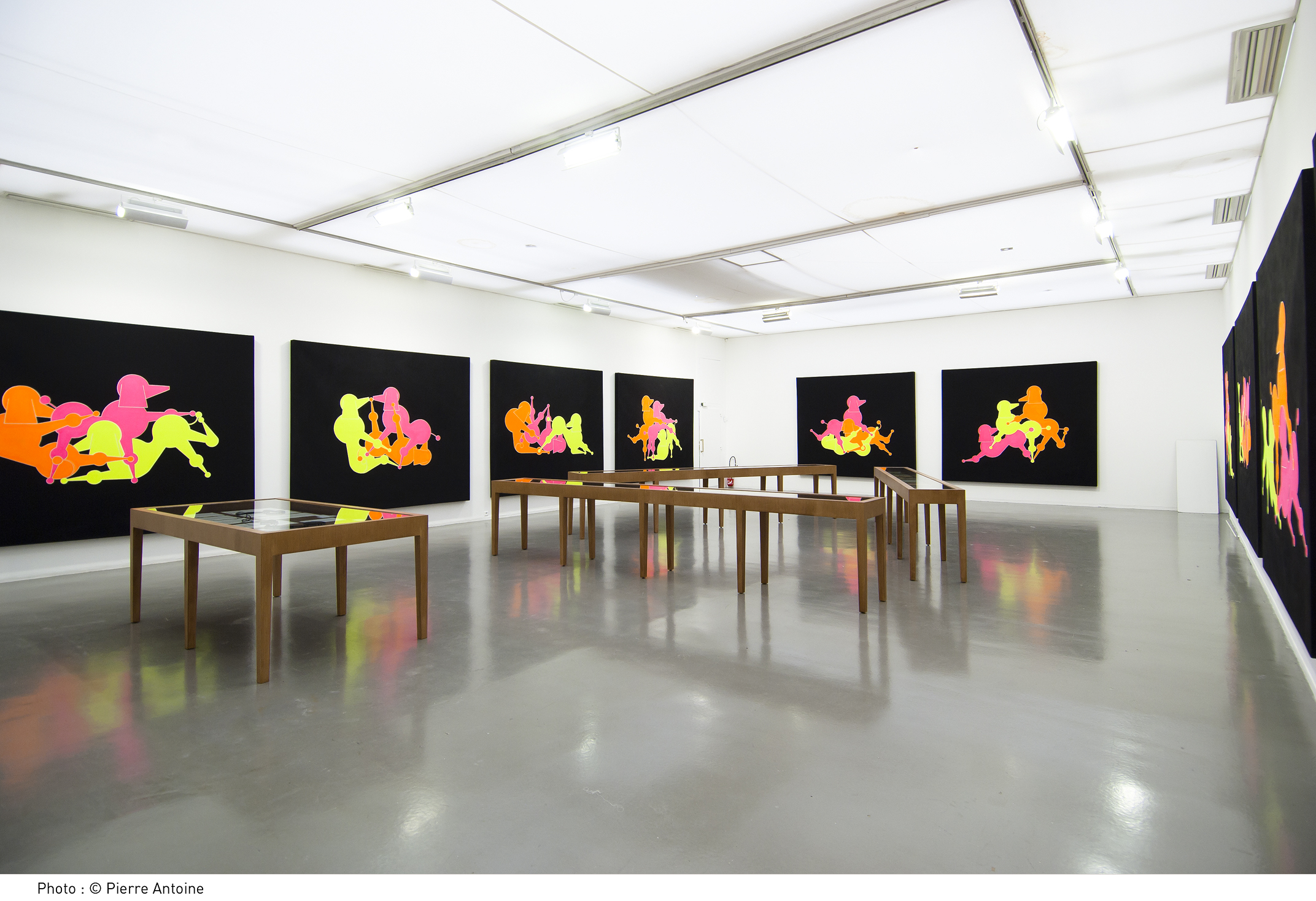 Mais l’exposition s’étendait plus loin, hors les murs de l’institution culturelle et loin des considérations de l’Histoire de l’Art, en devenant une sorte de happening banalisé, vulgarisé : le Centre d’Art étant situé dans un centre commercial, une cantine/restaurant en face de l’entrée servait ses plats dans des assiettes en porcelaine arc-en-ciel, exactement les mêmes que celles accrochées sur les murs à quelques mètres. Il s’agissait ici de parasiter un acte de consommation dans la vie quotidienne, le déjeuner.