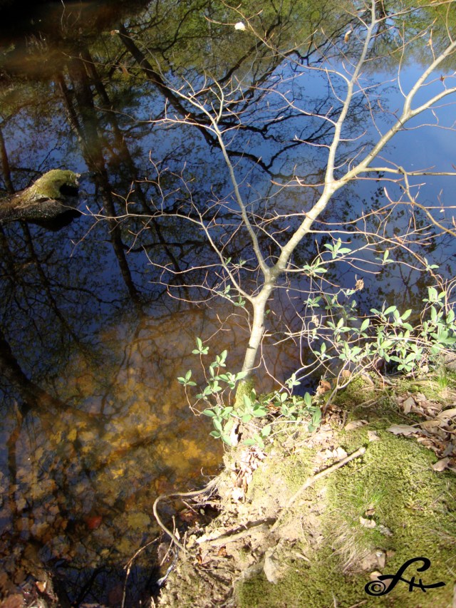 Au fond d’un l’étang à la surface si paisible, les feuilles mortes de l’automne se décomposent encore. L’eau les digère lentement et nourrit en même temps les arbrisseaux sur les rives. Les nouvelles pousses sont transpercées d’une lumière vert-acide. En un clin d’œil, cette nuance du renouveau, si intense, s’immisce et emplit le regard.