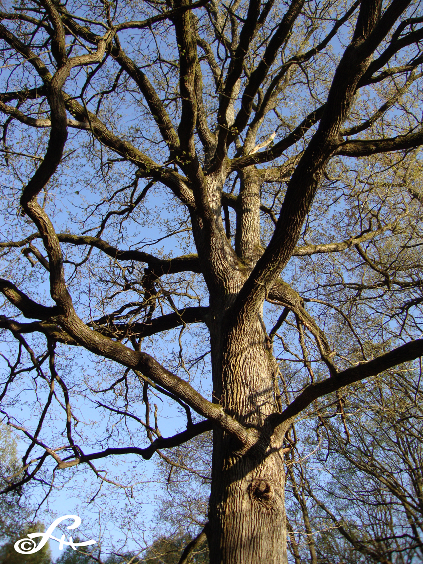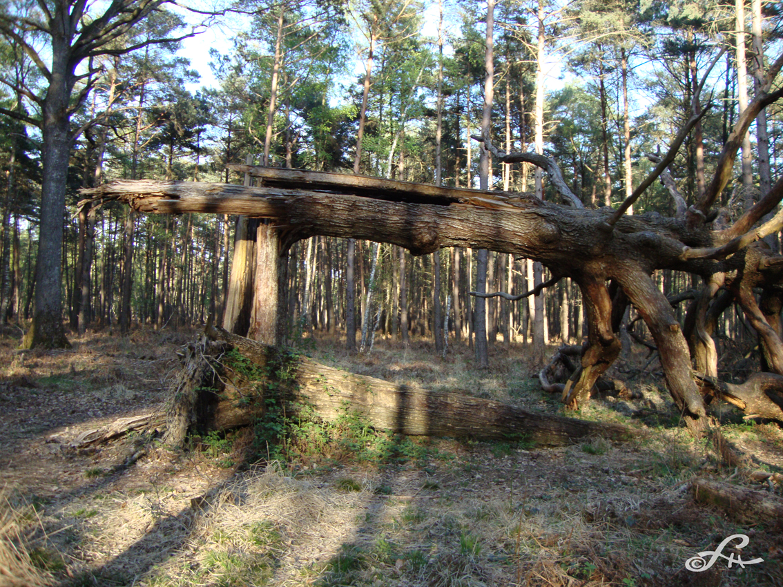 Un chêne tricentenaire, vrillé par une tempête, s’est effondré. Ses branchages secs et tortueux, comme un squelette d’éléphant bruni, délimitent un cimetière végétal où déjà d’autres générations d’arbres ont construit leur légende. Son tronc brisé fait comme une arche du Temps, pendant que dessous, silencieusement, la mousse et les insectes y prolifèrent. Une fillette s’amuse à escalader le géant gisant à terre.