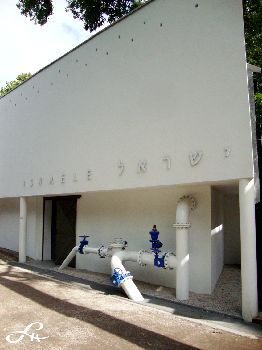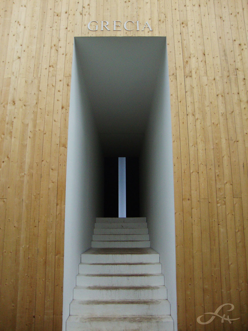 Pas très loin derrière, le Pavillon grec a été entièrement relifté par Diohandi dans un style nordique et très épuré. Une grande surface claire en bois de pin à l’entrée s’ouvre sur une fente de lumière, une invitation évidente à entrer qui fonctionnant sur l’attrait du mystère, de la révélation. Là encore, l’eau comme élément-métaphore, puisque le pavillon est entièrement transformé en passage, dans sa plus simple expression poétique : une allée en L au milieu d’un tapis d’eau vous fait glisser, tel un Jésus, un Bouddha en lévitation, à l’intérieur du bâtiment. Celui-ci est éclairé uniquement par l’ouverture artificielle du fond, comme un espoir, un attrait vers une autre dimension spirituelle, et la lumière naturelle arrivant par l’entrée et la sortie. C’est un beau moment de légèreté et