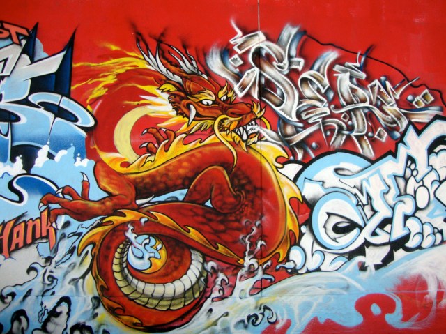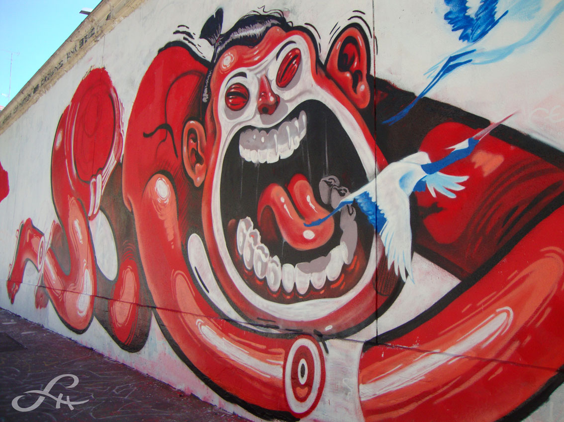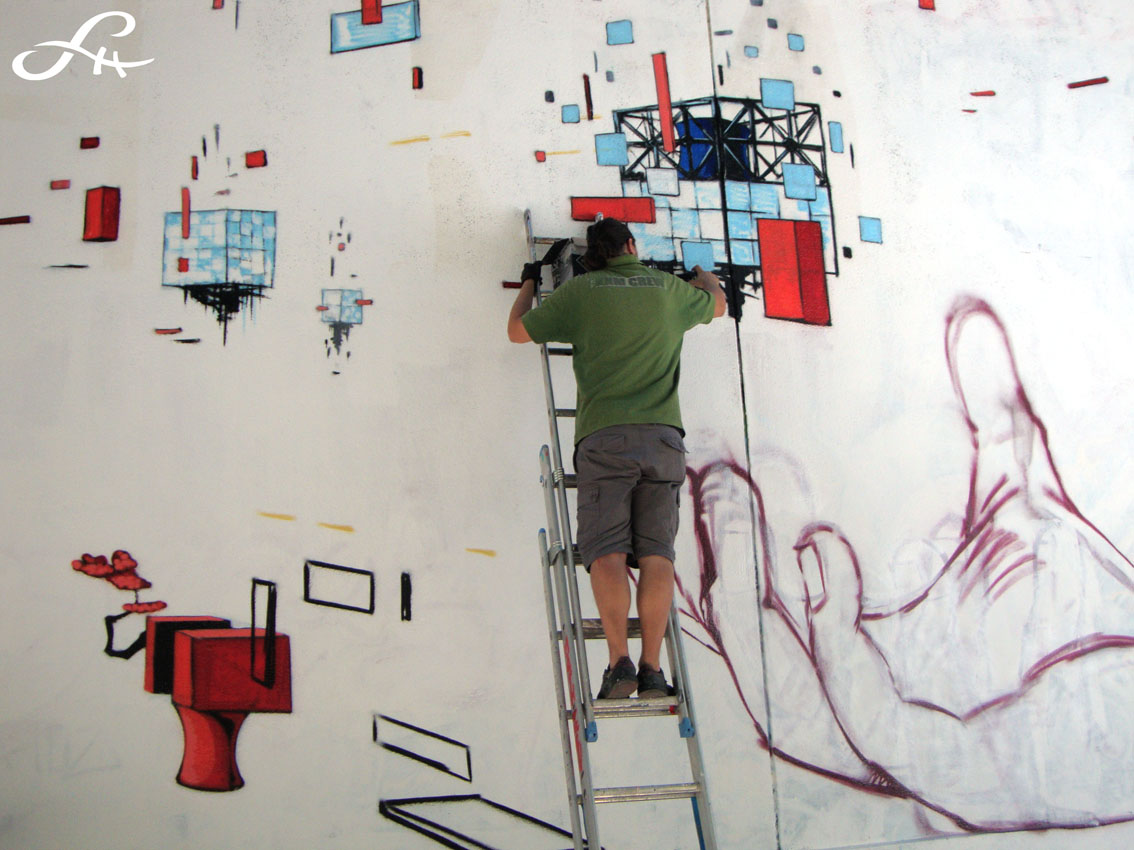 Espérons que, respect pour ce projet, la fresque pourra être contemplée pendant longtemps. De part et d’autre d’un grand disque rougeoyant – le soleil levant figurant sur le drapeau du Japon – se dessine une grande composition symétrique. Les différents styles des graffeurs se répondent d’une manière plutôt harmonieuse, peut-être même un peu trop appliquée, mais la fresque recèle des figures impressionnantes de dextérité. Deux immenses personnages entourent l’astre solaire, lui-même ombré par la silhouette d’une fillette émergeant des décombres. Un lutteur de Sumo maigrelet, découpé en tranches comme un vulgaire saucisson, et un clown bleu atypique alléché par des déflagrations atomiques accompagnées de l’insigne du $…