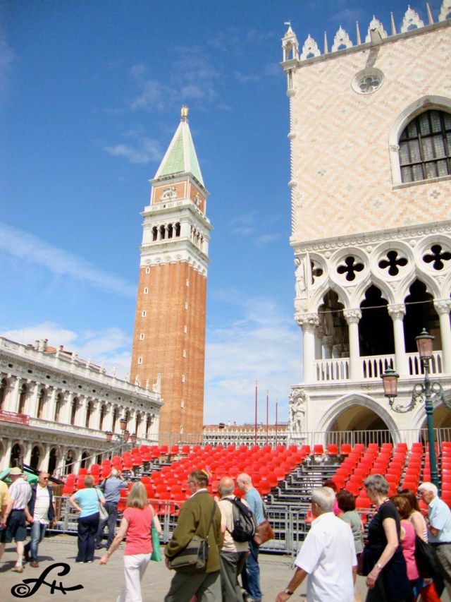 Summum de l’expérience méta touristique, la traversée de la Place Saint Marc en plein après-midi, avec le soleil qui écrase au sol la foule encore un peu plus compacte, comme si la perspective s’était aplatie, repliée sur la première rangée de jambes, de torses, de casquettes, de lunettes, d’appareil photos tendus, de regards émerveillés. La prolifération du décor sur les façades, le faste florissant, le vétuste dégoulinant. Lever les yeux pour retrouver partout des échappées vers l’azur, les perspectives penchées et les fenêtres en ogive, les ouvertures turquoises sur la lagune.