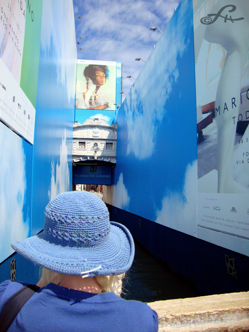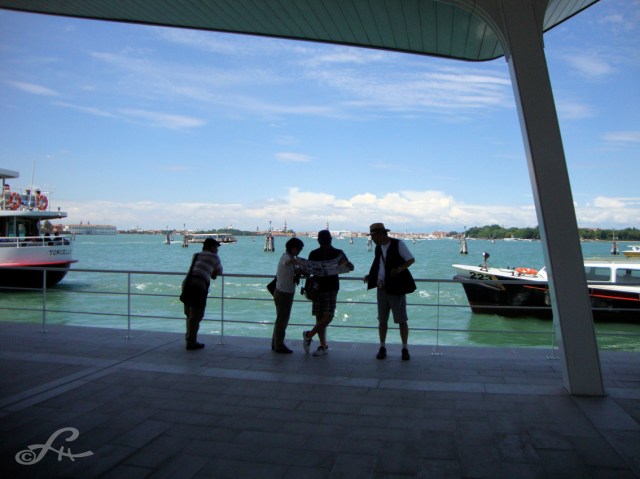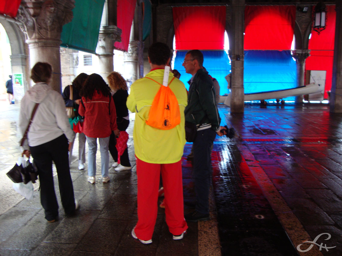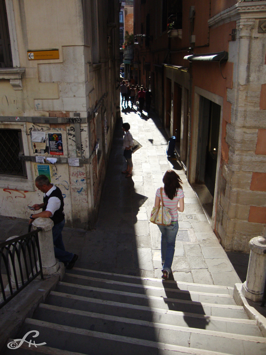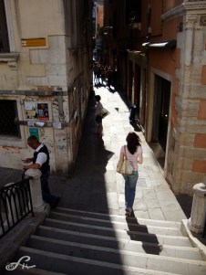 Cette impression d’être canalisé dans le flux humain ne vous lâchera que lors de petites échappées par les ruelles étroites, ou en dérivant vers certains quartiers périphériques. Et encore, les chemins de traverse en zigzag vous font immanquablement déboucher sur un quai grouillant. Une place, un coin d’église vous réoriente dans un trajet hyper emprunté. Embarqué vers un entonnoir, voici au fond le passage du pont du Rialto ! Coincé à nouveau au milieu d’un embouteillage sur pattes, on croise des visages qu’on ne regarde pas, peut-être saisi-t-on par ci par là des expressions différentes, des allures étrangères. Mais tous finissent par se ressembler ! Les ombres défilent au sol, sur les marches d’escalier. Ici, de jour, se produisent à chaque micro seconde des milliers de croisements aériens, terrestres et maritimes, des des évitements souples entre tant d’individus résolus à la galère du tourisme de masse. Et que dire encore des compressions des corps, des visages tournés vers le large, vers la skyline de la Cité des Doges, les courbes des dômes et les flèches des campaniles… C’est le prix à payer pour rêver tout éveillé dans la Sérénissime.