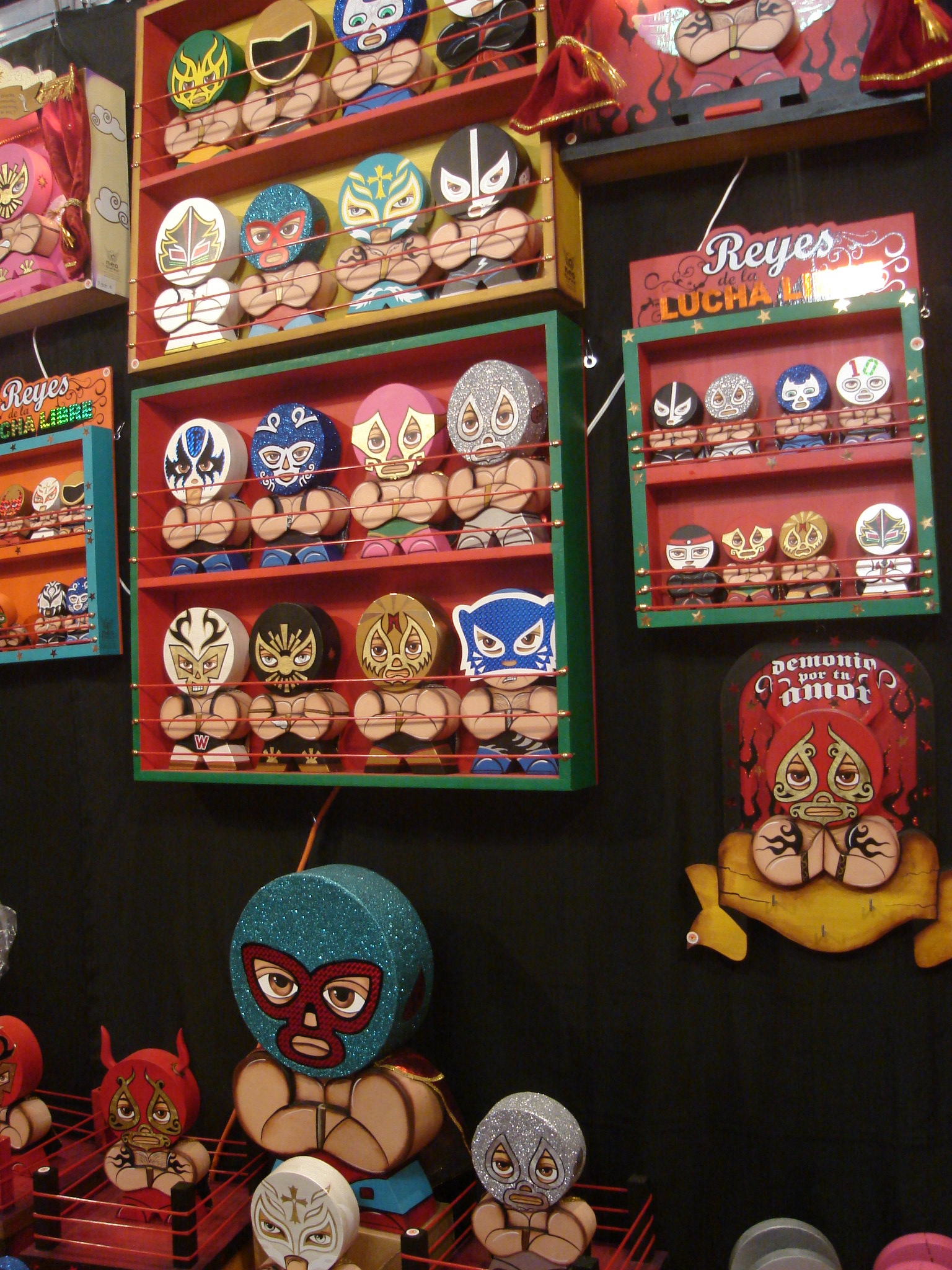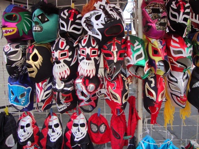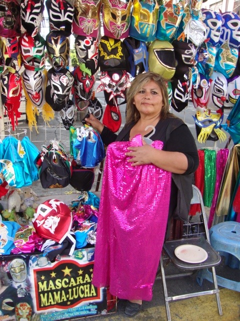Mais la Lucha libre ne s’arrête pas aux défoulements extatiques sur le ring et dans les gradins. Dans les rues jouxtant l’arena poblana, existe aussi une activité effervescente. De nombreux stands, des baraquements de bric et de broc, exposent à la vente les fameux masques/cagoules, histoire de participer au moins en apparence a la mythologie du catch mexicain ! On peut ainsi aller au stand de Mama Lucha admirer sa collection de masques, et en acheter un (entre 50 à 200 pesos pour les plus sophistiqués).