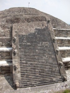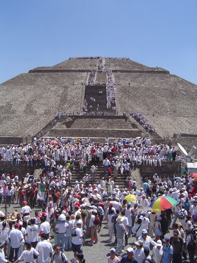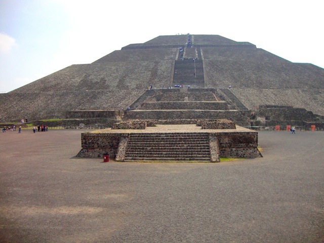 Surprenant de constater que la pyramide du soleil de Teotihuacán, et la grande pyramide de Khéops en Égypte ont la même surface au sol (225 m) mais la première est deux fois moins haute que la deuxième : 65 m pour Teotihuacan contre 144 m pour Khéops exactement ; 2,5 millions de tonnes de pierre contre 6,5…