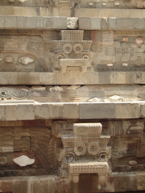 N’oublions pas de préciser que les monuments ont été largement reconstruits lors des restaurations dans les années 30. Ainsi il semble que la pyramide du soleil ait compté moins d’étages à l’origine. Nous ne voyons probablement pas les constructions telles qu’elles étaient exactement à l’origine. En regardant derrière certaines, d’ailleurs, on voit bien les parties non-dégagées, qui ne ressemblent guère qu’à des éboulis. Mais cela n’enlève rien à la magie du lieu, bien sûr.