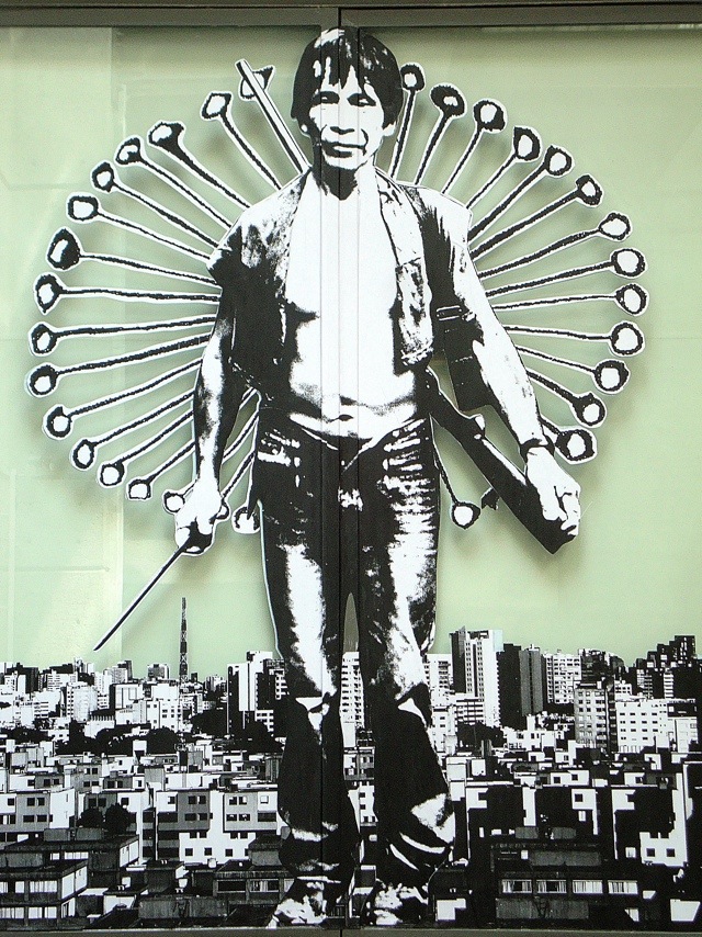 Avec l’exposition « Intersticios urbanos », le Centro Cultural de España à Mexico propose un joli parcours en pointillé sur le Street Art. L’exposition (qui vient juste de clôturer) tente de synthétiser différents supports artistiques : fresques géantes peintes en extérieur, collages, photographie, vidéos, installations plastiques, en passant par la sculpture, la peinture et la sérigraphie, le tout mixé dans un accrochage light et bien dosé. Dans la plupart des œuvres présentées prévaut le ton contestataire, l’interpellation et la provocation, dans la pure veine révolutionnaire, identitaire et libertaire des années soixante. Le Street Art affirme ici son rôle résolument politique, en plus de sa particularité esthétique.