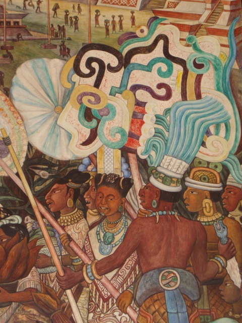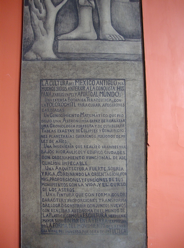 A l’entrée de la galerie des murales au second niveau, à gauche de l’escalier, on peut lire sur un piédestal en trompe l’œil ce texte qui fait l’éloge de la civilisation aztèque et la replace parmi les plus grandes du monde, comme la reconnaissance d’une grandeur enfouie sous les siècles de colonisation espagnole :