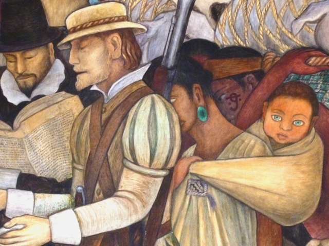 Nous entrons donc dans une évocation des différents épisodes du Mexique, allant de la Conquête espagnole, en passant par la période coloniale, les mouvements d’Indépendance, la Révolution, jusqu’aux dernières années 1920 – milieu des années 1930. On ne peut qu’être séduit, captivé, ensorcelé, premièrement par la dimension des œuvres, mais aussi par leur gamme colorée riche et intense, leur luminosité et leur force narrative. La construction plastique est audacieuse, et la réalisation picturale de Diego, souvent par petites touches de peintures juxtaposées, comme une immense parure réaliste faite de minuscules plumes précieuses aux couleurs vives, est extrêmement fine et élaborée.
