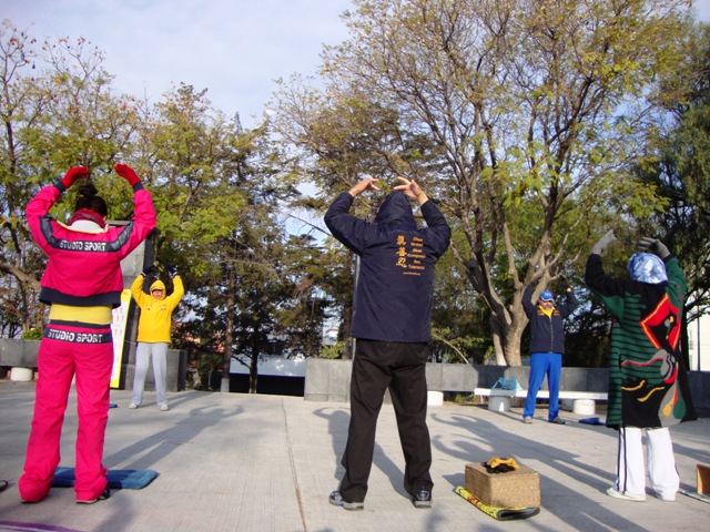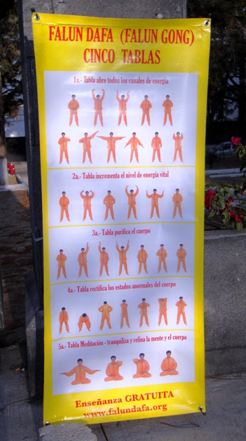 En tout cas, la motivation des enseignants bénévoles de la Paz semblent tout à fait sincère et désintéressée, allant dans le but d’un perfectionnement personnel et social. À cela, pratiquant le Yoga depuis plusieurs années, je n’y vois rien de mal ! La référence à la Voie du Tao est fréquente, le maestro porte le titre de « Grand Maître de l’École de la roue de la Loi de Bouddha », alors avec ces illustres et vénérables références… Une petite musique traditionnelle chinoise vient accompagner la séance, d’une heure et demie environ, ponctuée par la voix et les indications enregistrées du maître. Chaque dimanche, suite à la pratique en plein air, dans la fraîcheur matinale et avec une vue splendide sur le Popocatepl lâchant quelques fumerolles, a lieu une lecture et discussion sur les écrits de Li Hongzhi. C’est ainsi que Berenice, ex prof de Yoga me confiait qu’elle avait arrêté le Yoga pour se consacrer entièrement au Falun Gong, selon elle d’un niveau de conscience plus élevé… Toute pratique qui peut contribuer à installer sur Terre plus de paix et d’harmonie est à cultiver !