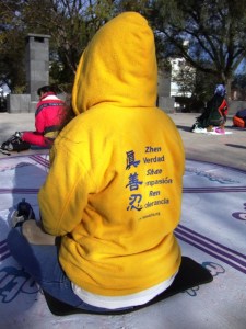 Sur le terre-plein central du petit parc, une vingtaine de personnes suivait en rythme lent les gestes ressemblant au Qi gong, dirigés par un maître et aidés par quelques assistants. Des hommes et des femmes vêtus de jaune d’or, avec les trois préceptes Verdad, Benevolencia, Tolerancia brodés sur leurs blousons ou sur leur casquette. Invité par Pilar, une des assistantes, je me suis décidé à suivre les exercices qui s’apparentent à de la relaxation debout. Il s’agit en fait de 5 étapes dans l’élévation de l’état général, le premier étant un exercice dynamisant pour le système musculaire et nerveux, le dernier terminant la séance par une méditation assise de quarante minutes.