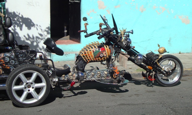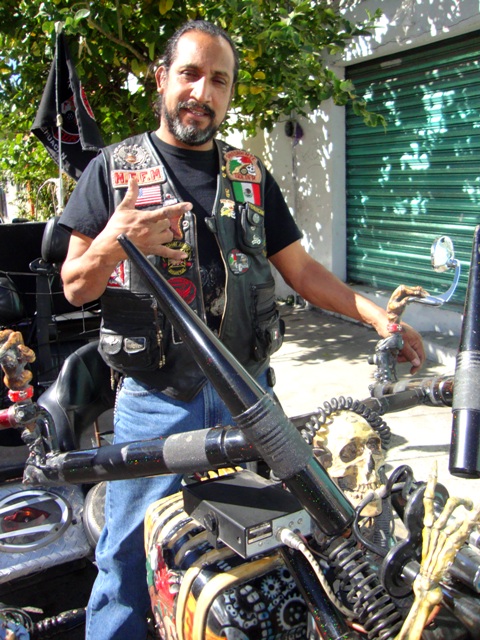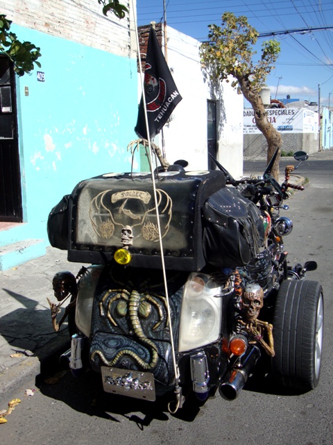 Deux ans, c’est le temps qu’il a fallu à Ernesto pour réaliser un rêve, construire et customiser complètement sa fabuleuse machine vrombissante : un trike. Ernesto fait partie du fameux club des Mixtecas del Sur, une écurie de bikers rock-gothique mexicains, qui est aussi très présent aux USA. Fier de son appartenance à ce club, après avoir échangé quelques paroles, il me présente son blouson de cuir frappé aux armoiries des Mixtecas del Sur.