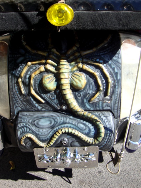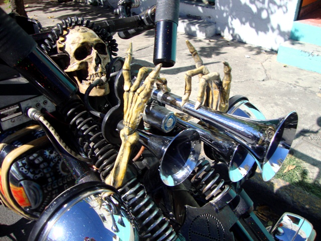 ¡ El aspecto » Super Muerte » de la máquina podría hacer temer a un hurón como un propietario, no es nada! Muy amable, Ernesto me contio que él mismo esculpió cada una de las ornamentaciones con plastiline. Calaveras amenazadoras que dan un estilo dark, poco piratea al bólido ¡ Mucha ingeniosidad y estilo, una sorpresa de talla, muy prudentemente arreglado delante de la casa del artista, lista para despegar!
