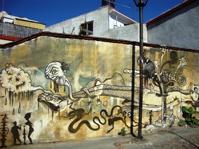 Également d’aller dans les quartiers de Jalatlaco et Xochimilco, plus au nord, qui sont aussi devenus des vitrines pour les artistes urbains locaux et internationaux. Ces deux quartiers sont désormais des zones charmantes, aseptisés et Air$Bérisés pour plaire aux habitants éphémères des USA et d’Europe, mais on peut y voir de belles œuvres.