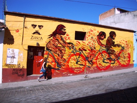 Plus centrale, la galerie Arte Jaguar, propose un joli pannel d’Art Street oaxacaño. Elle est tenue par SMEK, ayant une solide réputation dans le milieu, et son frère SEV. Au moment de ma visite étaient exposités des mangas mexicains. C’est un point stratégique pour l’achat de bombes aérosol, et donc un lieu d’échange entre les différents crews de la ville. On y trouve une bonne documentation sur le Street Art international.