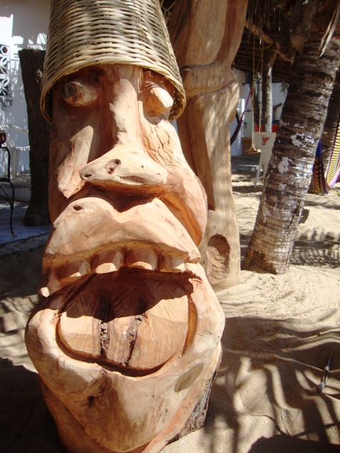Tuto est une force de la nature. Il suffit d’entrer dans son hôtel/atelier pour s’immerger aussitôt dans son univers étrange et envoûtant : des visages, des personnages, des mains comme libérés d’énormes souches d’arbres qu’il va lui même chercher dans les rivières, sur la côte pacifique du Mexique. C’est exactement à San Agustinillo, dans l’État de Oaxaca, qu’il a élu domicile depuis 6 mois. Chilien d’origine et voyageur infatigable, il a bourlingué dans de nombreux pays d’Amérique centrale et au Mexique pendant 20 ans.