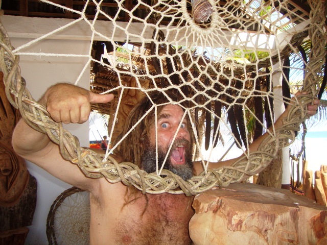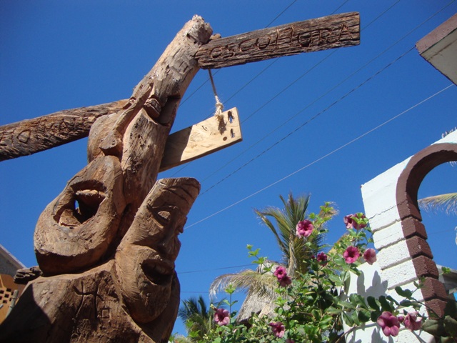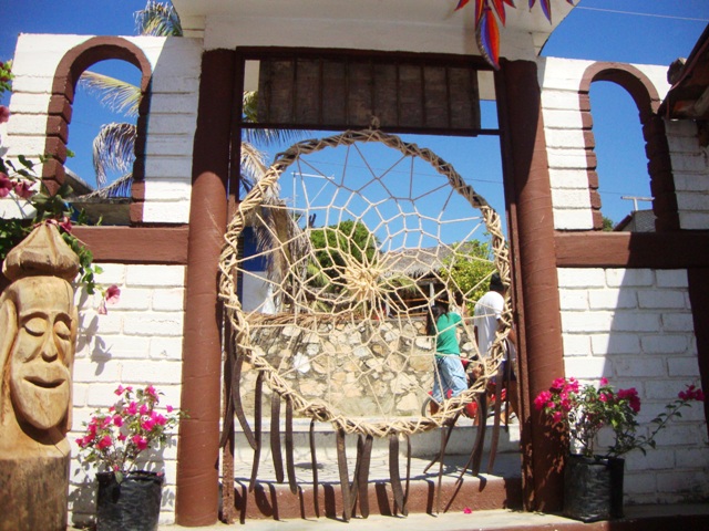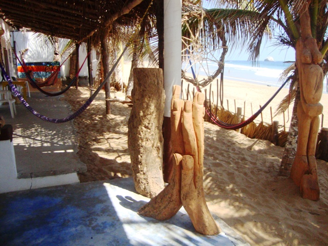 Lorsqu’il est arrivé à San Agustinillo avec juste sa camionnette et son matériel de sculpteur, Tuto a rapidement vendu une grande table sculptée dans un tronc d’arbre massif à un hôtel de la côte. Cela qui lui a permis de louer d’abord pour trois mois ce bel espace, juste en face de la plage, magnifique. Il a commencé par restructurer le lieu, en y amenant plus d’ombre grâce à une toiture en palmes, plus propice à son activité très physique. C’est d’ailleurs dans un tronc de palmier qu’il a réalisé sa première sculpture au Mexique. Avec sa toute première vente, il a acheté le matériel de taille sur bois avec lequel il travaille encore. Puis les affaires allant sur la côte pacifique, avec d’autres commandes et des ventes ambulantes dans sa camionnette, il a aussi aménagé quelques cuartos à son image, simples et rustiques, soit quelques chambres barratos (bon marché) à louer face à l’océan immense.