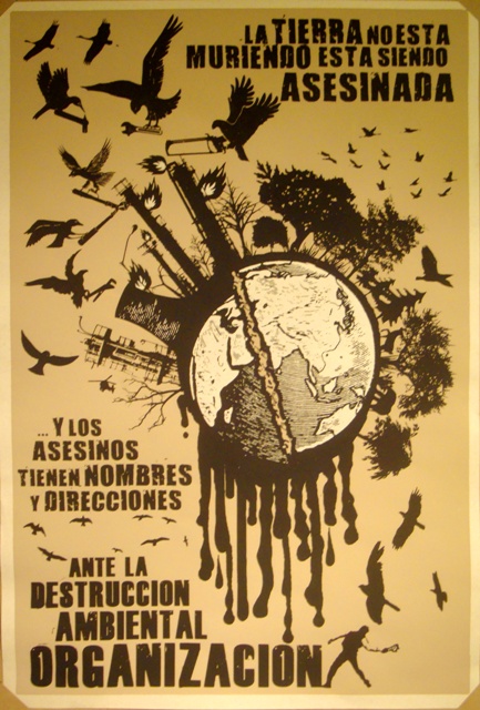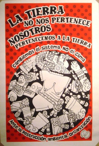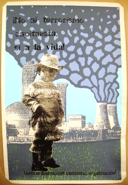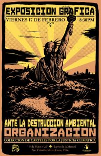 « Dans le cadre du changement climatique, avec la problématique de la destruction environnementale, du consumérisme comme politique d’aliénation, de la coupe du bois, de la perte d’humidité, de l’accaparement de l’eau, de l’usage des énergies sales comme celle nucléaire, la construction de remparts contre les intérêts capitalistes, contre les mafias des corporations transnationales recevant l’appui des gouvernements subordonnés à l’impérialisme, ainsi que contre les conséquences de l’extraction et la consommation des hydrocarbures, sont les sujets qu’ont abordés différents acteurs de la culture : des dessinateurs graphiques, des graveurs et des peintres, tous activistes et faisant partie de différents collectifs du Mexique, qui ont participé conjointement à la conception et réalisation de dix cartels de 47,5 x 70 cm, en impression sérigraphiée ; des propositions développées sous le slogan « non au changement climatique, oui au changement systémique, non à la destruction environnementale, oui à la destruction du capital ».