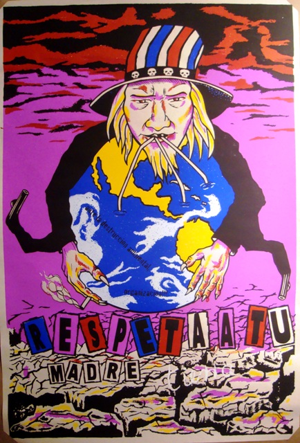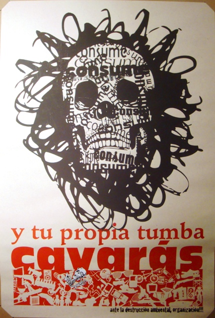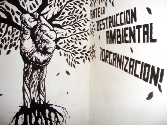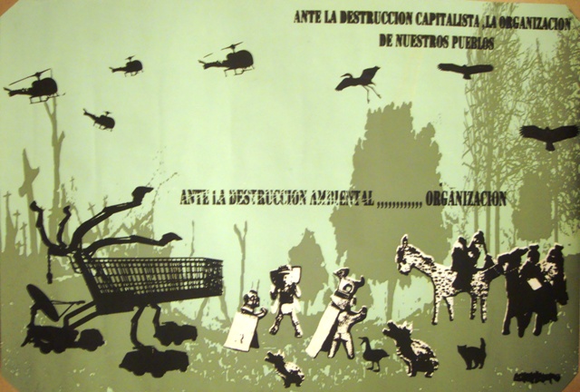 Le vendredi 17 février 2012 avait lieu le vernissage de l’exposition « Ante la Destrucción Ambiental, ORGANIZATIÓN » organisé par le collectif Otros Mundos au centre culturel El Paliacate, à San Cristobal de las Casas dans le Chiapas. Une sélection d’une vingtaine de sérigraphies de moyen format était présentée sur les murs du premier niveau, dans cet espace pluridisciplinaire alternatif. Ce même soir on pouvait voir dans une petite salle à l’étage un documentaire produit par Otros Mundos AC et Amigos de la Tierra México, « REDD, La codicia por los árboles », qui permettait de mieux comprendre les enjeux commerciaux et politiques qui étouffent ce territoire du sud du Chiapas, la Selva Lacandona, deuxième poumon vert d’Amérique latine, unique pour sa biodiversité.