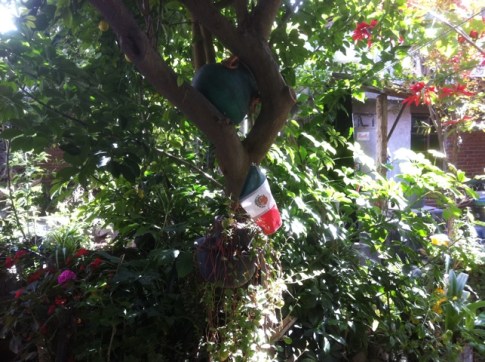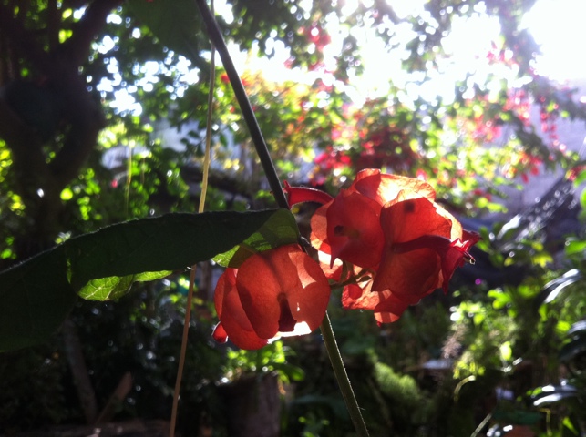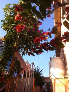 Dans le jardin mexicain, des fleurs multicolores s’ouvrent à votre passage. Le bougainvillier lance dans l’air ses gerbes sanguines, des éclaboussures rose fushia. S’y promener est une dissection à ciel ouvert. Le regard y plonge, aspiré par l’infinité des nuances émeraudes, des fluorescences vermillon et or, tandis que l’âme s’ébranle doucement jusque dans son lieu le plus intime. Un dialogue muet avec les espèces végétales se met en place, c’est le réveil des innocents. Hop, un colibri papillonne par ci par là, il vient se gorger du suc des fleurs à peine écloses dans un froissement de plumes-étamines. L’humidité de la nuit est vite dispersée par les rayons de soleil déjà brulants. Le chat de la maison en profite pour faire son repérage matinal et escalader les terrasses en ciment. Les toits de tôle ondulée s’animent déjà sous la chaleur.