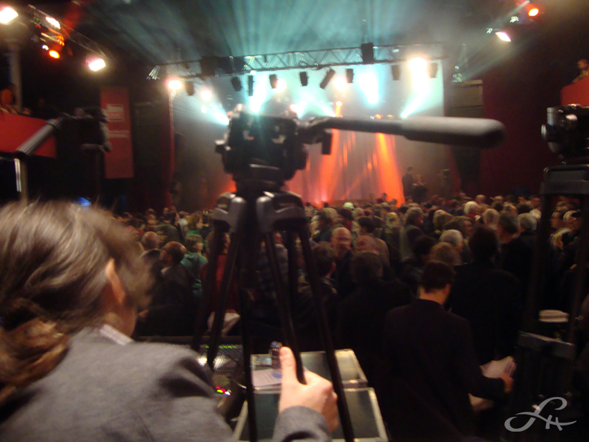 Maintenant nous allons passer aux choses sérieuses, car je suis là pour entendre des discours raisonnés et argumentés, m’imbiber de convictions politiques, je veux pouvoir donner du SENS à mon possible ralliement au Front de Gauche. Et là quelle bonne surprise, je comprends enfin que je suis venu pour une grande soirée, programmée aussi par le PC, ayant comme thème central et unique la CULTURE, l’Art et l’information. Information prend rarement une majuscule (même si j’estime que ce que je fais en ce moment pour retranscrire et diffuser l’expérience de ce moment unique est tout un art) mais peut-être qu’avec Jean-Luc, même les présentateurs du JT de TF1 seront libres un jour et le droit à une information intelligente, libre et critique pour tous ne sera plus seulement un fol espoir !