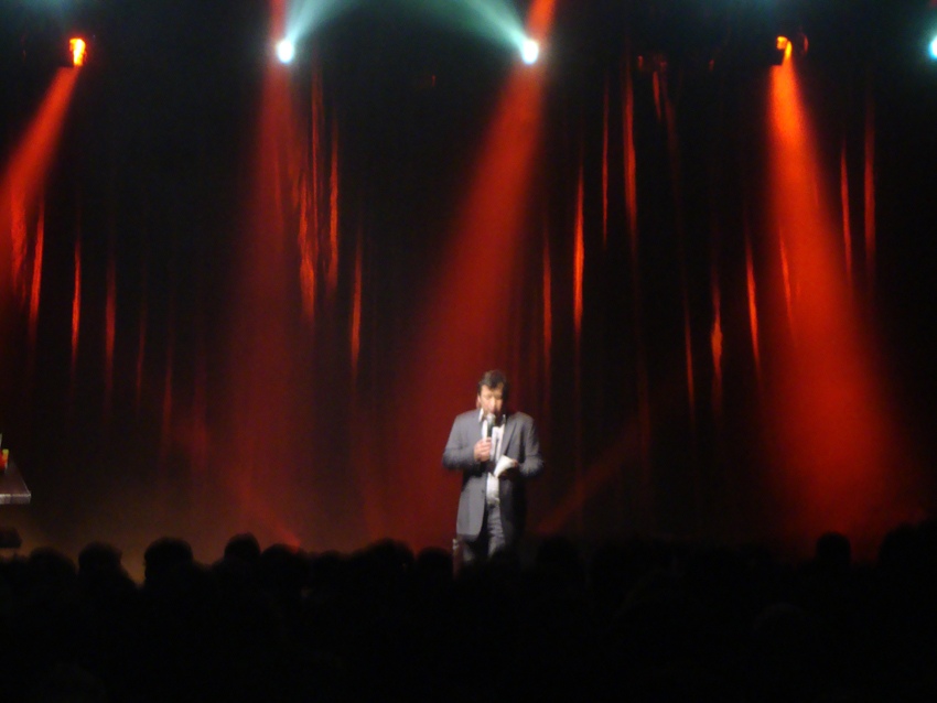 confirment la poussée mélenchoniste. Claude Michel cite Roland Gori, psychanalyste dont la parole et le langage ont une place essentielle dans son écriture et son enseignement. Car il s’agit avant tout ce soir comme dans chaque réunion FdG de se réapproprier symboliquement les mots, de libérer la parole qui comme chacun le sait depuis Deleuze et Foucault, est un réel enjeu de savoir et de pouvoir. C’est effectivement encore ce soir, avec tous ces gens de culture, que le langage s’affirme comme le pivot de la pensée consciente, autour duquel s’articulent tous les discours et les actes, et grâce auquel on se construit soi-même. Et c’est uniquement grâce au dialogue qu’une société peut se penser et s’élaborer démocratiquement. Afin de le prouver, Paul Sevillard nous offre ce beau lapsus : « la profonde conviction du con de gauche » qui fait rire toute la salle et replace quelque part les choses dans une réalité très… humaine justement (l »humour est aussi un art, parfois improvisé). Remettre l’humain au centre de la société, c’est en gros le fil conducteur de la soirée, et plus généralement le cordon ombilical dans la dynamique du Front de gauche. Le public est déjà un peu chauffé et plus concentré.