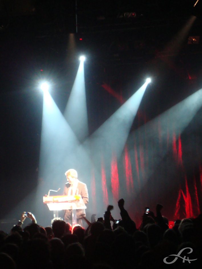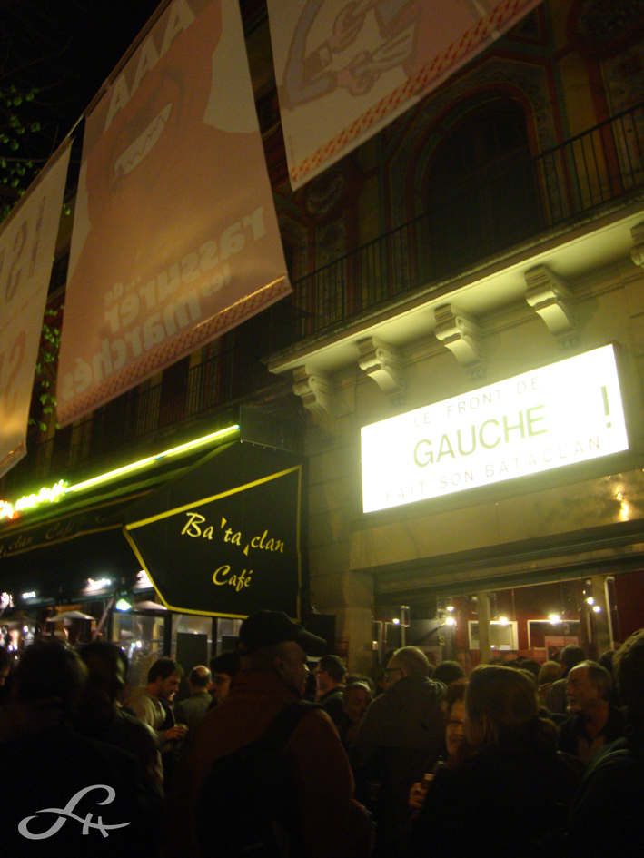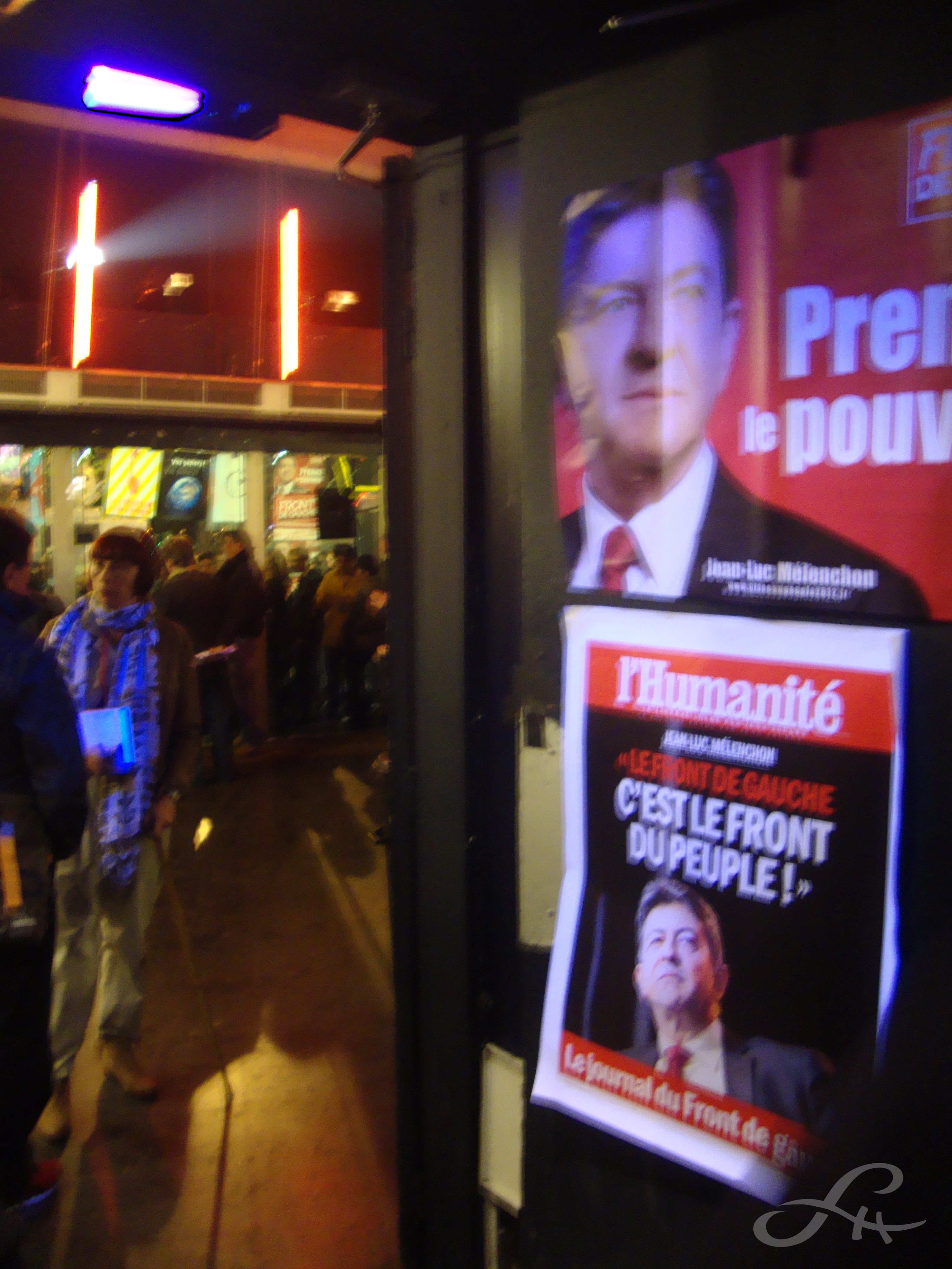 J’avais déjà loupé la manifestation/ meeting à la Bastille, évènement qui m’avait semblé exceptionnel lorsque vers les 17h30 j’avais fini par rejoindre à vélo l’emblématique place parisienne : les regards pétillants, les sourires lumineux glissant au dessus des tracts rouges qui jonchaient le sol m’ont tout de suite fait comprendre que je venais de rater un grand moment de joie et de partage. Cette fois-ci je serai à l’heure ! J’arrive donc devant le Bataclan pile à 19h30, comme me l’avait indiqué le blog de Jean-Luc (Internet favorise tellement ce sentiment de proximité !). Encore loupé me dis-je, car évidemment le succès aidant, le trottoir était rempli d’une foule nombreuse mais relativement calme. Une file s’étirait rapidement du boulevard Voltaire jusqu’au coin de la rue Oberkampf, le temps que je m’approche pour comprendre qu’en plus il fallait s’inscrire via le Net. Ce détail ne m’avait pas vraiment sauté aux yeux sur le blog de Jean-Luc… Doublement loupé, mais bon, je ne me démotive pas, et entrainé par les chants et la bonne énergie communicative des Mélenchanteurs, j’avance sur le trottoir.