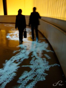 Vertige des croisements tous azimut, abysses ou sommets de la pensée… Le réseau urbain ou virtuel est une envolée de pensées, une concentration et un éparpillement à la fois. La ville absorbe, nourrit et amplifie, la ville gaspille car elle est aussi dévoratrice d’énergies. À l’image des interconnexions synaptiques, des flux de courant électrique, comme celle qui circulent dans les câbles de cette ville immatérielle qui ne dort jamais. Sur certaines animations urbaines on peut suivre en accéléré les mouvements des portables, l’intensité de l’envoi des SMS en fonction du temps, feu d’artifice nocturne de la communication à tout va. Comme vers une vitrine ou un bar éclairés, l’internaute se dirige vers ce qui semble être un foyer de chaleur humain, virtuel certes, mais avec parfois une interaction en temps réel, pour arriver jusqu’à une page ou un forum de discussion, des rencontres et des dialogues/conversations via ordinateurs ou smartphones interposés. De l’autre côté de l’écran, des mains, des présences lointaines, vont composer un texte, mettre en ligne une photo ou une vidéo dans un jeu de miroirs, une stratégie d’apparitions/disparitions.
