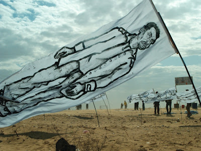 Suite au révolutions arabe, Zoo project a décidé de faire un grand périple de l’autre côté de la Méditerranée. C’est en Tunisie qu’il a posé ses pinceaux, pour à sa manière appuyer ce grand mouvement populaire d’émancipation né il y a plus d’un an, toujours en devenir et toujours en danger d’être récupéré ou perverti. Contrairement à son travail dans la mégapole d’Ile de France, il a voulu redonner un visage et une mémoire aux martyrs de la révolution, dont nous connaissons certainement le premier : Mohammed Bouazizi le vendeur de fruits qui, ne pouvant plus nourrir sa famille, s’est immolé le 17 décembre 2010 sur la place de Sidi Bouzid puis est mort deux semaines plus tard des suites de ses blessures dans un hôpital près de Tunis, ce qui a déclenché les émeutes entrainant au « dégagement »de Ben Ali le 14 janvier 2011. Ils sont officiellement 236 martyrs de la révolution tunisienne recensés, auxquels Zoo project a voulu rendre hommage en réalisant pour chacun un portrait découpé, en pied et grandeur nature, d’après les photos et les témoignages de proches qu’il a pu récolter. Il explique très bien ses motivations et sa démarche sur son site ZOO-PROJECT.
