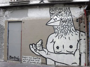 La capitale a rapidement adopté ces nouveaux arrivants étranges. Un style pourtant décalé par rapport au Street art parisien, qui a depuis longtemps succombé à la technique du graff et de la peinture aérosol. Ces créatures sont nées en Seine Saint Denis, pour venir coloniser les façades aveugles et les devantures de magasin abandonnés du nord-est de Paris, et plus particulièrement le XXème, le XIXème et le XVIIIème arrondissements. L’artiste qui signe ces fresques murales et que j’appellerai aussi Zoo project se définit sur son blog comme un « Franco-algérien résidant à Paris ». Il a juste 20 ans.