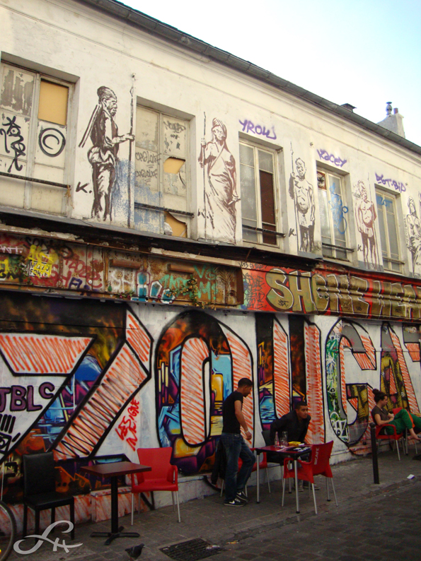 Depuis la destruction des bâtiments vétustes de la rue de l’Ermitage, haut lieu du graff sauvage (quelques œuvres subsistent encore autour du Studio et à l’entrée du passage de l’Ermitage), c’est plus bas vers les boulevards qu’il faut aller trouver les spots encore en activité. Et ça bouillonne autour du métro Belleville, avec le mur collectif gigantesque de La Forge (autre lieu emblématique de la résistance du quartier, une ancienne fabrique de clefs, récemment transformée en ateliers d’artistes). La rue Dénoyez à quelques mètres, est devenue un havre de l’expression libre, sorte de réserve artistique très concentrée, au décor proliférant et changeant constamment. Devenue piétonne, la rue abrite quelques galeries spécialisées Street Art, dont Frichez-Nous la Paix qui organise régulièrement des expos/vernissages dans son petit espace, et où on pourra trouver des infos sur le quartier et ses artistes. Beaucoup de ses acteurs actuels sont issus du plus vieux squat parisien rue de la Grange-aux-Belles, dans le 10éme arrondissement voisin.