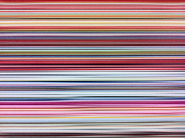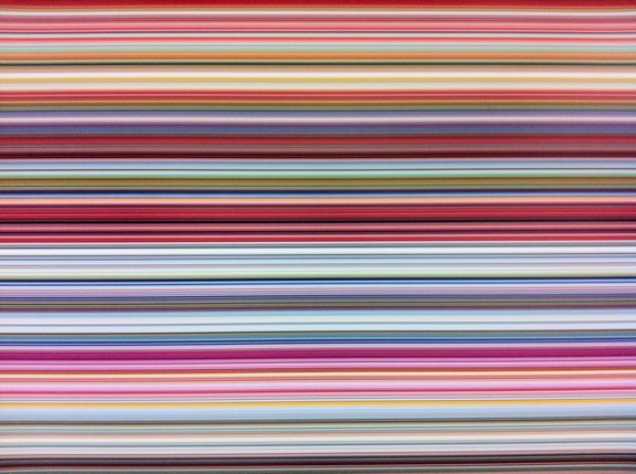 Gerhard Richter, dans sa recherche sur le processus de la vision, est même allé jusqu’à reproduire des gammes de couleurs industrielles, une provocation artistique sous la forme d’échantillons géants, rectangulaires, avec la série des Nuanciers (ci-dessus en introduction de la vidéo du Centre Pompidou). Cette première confrontation radicale avec l’automatisation et la classification scientifique, débarrassée de tout affect, s’est prolongée dans ses dernières œuvres, pour lesquelles il a fait appel à la technologie numérique. Avec Strip, en 2011, le spectateur plonge son regard dans un univers visuel sans limite, qui se tend entre infiniment petit et infiniment grand. « Le point de départ est une peinture abstraite, réalisée par l’artiste en 1990 et exposée dans Panorama en salle 5. Aidé d’un logiciel informatique, il a divisé verticalement cette œuvre, d’abord en 2, puis en 4, 8, 16, 32, 64, 128, 256, 512, 2048 et 4096. ce processus a conduit à la création de 8 190 bandes, dont la longueur correspond à la hauteur de la peinture de référence. » (album de l’exposition). Pour vous amuser, agrandissez ce détail de Strip ci-dessous, en zoomant progressivement : de nouvelles lignes, de nouvelles couleurs apparaitront, comme surgis d’une ligne d’horizon virtuelle.