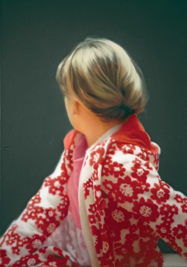 Davantage que sa relation à la photographie, j’aimerai rapprocher l’œuvre de Gerhard Richter en général, à une vision cinématographique. Premièrement parce que son parcours artistique est un vrai scénario, comme le montre bien la succession chronologique des salles d’expo, avec leurs thématiques propres. Il y a une première rupture initiale radicale (le refus du courant abstrait dominant avec les Photos-peintures, pour y revenir d’une manière lyrique, voire criante, dix ans plus tard) suivie d’autres encore, qui sont autant d’épisodes différents qui construisent une même et unique histoire personnelle, et à la fois une relecture très pertinente de l’art contemporain. Il y met également en scène ses proches, sa femme, ses enfants, tandis qu’il sort de leur contexte des évènements historiques, pour les intégrer dans son travail, les dé-dramatiser en leur donnant une autre dimension. De la même manière, directement, par des effets de zoom puissant, il recadre des toiles de maître (Annonciation d’après Titien) et leur donne une nouvelle direction. La citation aux anciens est toujours présente, qui constitue un trait d’union narratif entre les courants artistiques passés, présents et à venir.