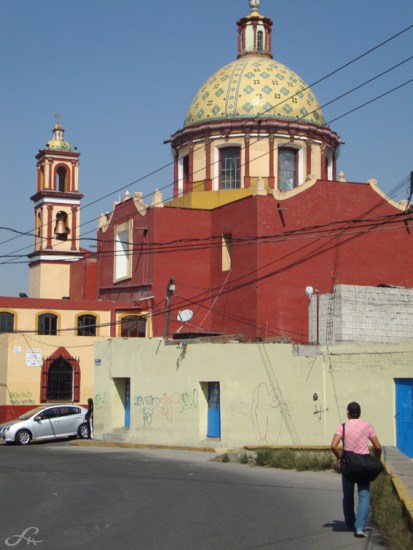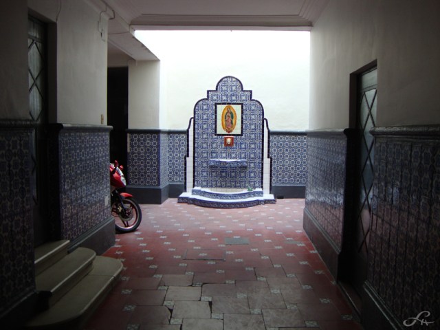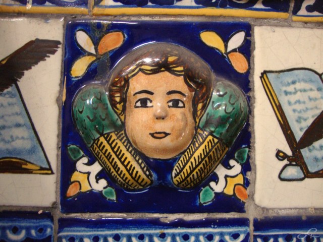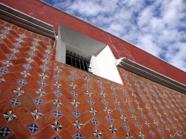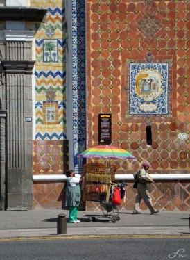 Dans une fantaisie toujours renouvelée, décoratifs et signe extérieur de richesse, les carreaux de céramique peinte recouvrent façades, toitures et mobilier urbain. Ils animent les palacios (anciens palais) coté rue et côté patio (cour intérieure), ponctuent les ouvertures, ornent les fontaines, dômes, et font scintiller Puebla sous tous ses angles. Ci-dessus dans le diaporama, on peut voir parmi les compositions classiques et baroques, souvent flirtant avec l’orient, l’influence du Barcelone de Güell et de l’Art-Déco, jusque à l’adaptation au style fonctionnaliste des années cinquante. Pas étonnant que dans ce jeu de reflets infinis, la ville des Anges devienne un peu narcissique. Les nombreuses églises catholiques, dans le but d’offrir une vision dans toute sa magnificence de la nouvelle organisation chrétienne, ont surenchéri d’ornements extérieurs et intérieurs. Certains racontent que les coupoles des églises, qui sont dressent vers le ciel leurs courbes totalement recouvertes de talaveras, reflètent parfois les ailes des chérubins, qui y viennent jouer à cache-cache et s’y mirer…
