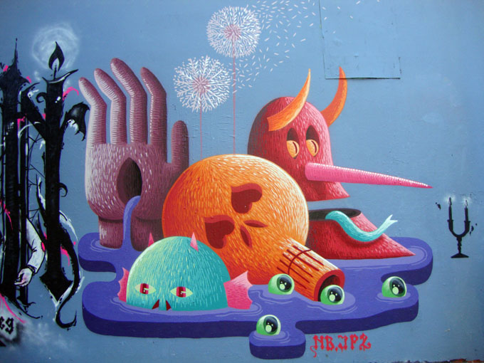 Si vous flânez le long du bassin de La Villette dans le 19e arrondissement de Paris, allez jeter un coup d’œil rue Henri Noguères. C’est un passage assez peu emprunté, situé entre l’Avenue Jean Jaurès et le quai de Loire, et dont l’activité principale tient à la présence d’une école primaire, avec ses entrées et sorties régulières d’enfants accompagnés des parents. Mais c’est aussi devenu un spot très fréquenté du street art, puisque en face du bâtiment neuf de l’école, tout en verre et acier, se trouve un long mur et deux façades aveugles, comme offerts à la verve plastique des artistes de rue.