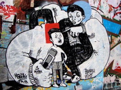 Les images aussi savent parler et dire des désirs, des besoins, des craintes, des dépassements. Questionnement et dépaysement constant que ce flux d’images peintes, collées, graffées, qui viennent se projeter et se fixer sur les murs du quartier. La rue Dénoyer et ses alentours sont constamment en re-création. Ce spot parisien quasi institué (lire Belleville, un village labellisé Street art) se recharge en permanence de vibrations diverses. Des énergies créatives contrastées et parfois contradictoires se répandent librement par couches, sur les façades, sous les corniches, sur le mobilier urbain. Un nouveau décor, une signature inconnue, une nouvelle strate recouvre d’anciennes écritures. Des éléments graphiques désormais occultés, se fondent dans un processus de sédimentation artistique collectif.