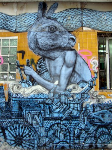 À l’angle du Boulevard de Belleville et de la rue Lemon, une étrange arche de Noé à vapeur est apparue, manœuvrée par un homme-lièvre : infernale cathédrale articulée, mécanique fumante et froide, vaisseau mythologique en devenir… L’équipage se compose de reptiles et de tortues tandis qu’un serpent ondulant – le serpent de la tentation et de la connaissance ? – entoure la composition en évoquant le ciel, puis repasse par une cheminée pour se mordre la queue. Cette machine de science-fiction rétro, bateau à aube d’un temps indéfini signée Roti est au croisement de l’univers de Jules Vernes et d’Edgar Allan Poe, lancée à l’assaut d’on ne sait quel avenir. A moins qu’elle ne soit tombée en panne ; ou qu’elle se soit justement amarrée là pour délivrer quelques vérités ? La fresque, qui s’étale sur les carreaux de céramique ocre d’un restaurant juif, a une technique intéressante : le dessin, effectué à la bombe de peinture noire sur un remplissage bleu et gris, est comme une succession d’éclaboussures bien maîtrisées, et crée une matière étonnante, sorte de dripping figuratif et expressionniste. Vision de rêve ou de cauchemar, on pense aussi ici à Lovecraft.