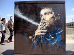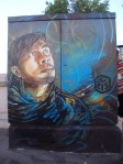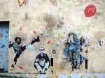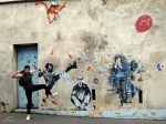 Beaucoup d’artistes du Street art de la première génération ont fait leurs griffes sur les murs et autre mobilier urbain du treizième arrondissement de Paris. On y trouve ainsi pas mal d’œuvres de Jef Aérosol, quelques unes de Miss Tic. Mais également des œuvres d’artistes ou de collectifs plus jeunes, comme C215 et léZarts de la Bièvre. Cet arrondissement est toujours relativement populaire, malgré la construction du grand quartier hightech et glacial de la bibliothèque François Mitterrand / Avenue de France. Au milieu des nouvelles constructions en verre et acier, le site artistique des Frigos, d’anciens entrepôts frigorifiques situés le long des voies de la gare d’Austerlitz et transformés en lofts depuis les années 80, semble désormais complètement anachronique ! Ce lieu, avec ses façades vétustes et plusieurs fois peintes, reste cependant un spot assez vivant pour l’art urbain (voir ces photos de Vitostreet).
