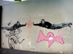 Mais il faut se balader ailleurs, par exemple dans le quartier de la Butte aux Cailles, où la plupart des photos ont été prises, pour de meilleures surprises. Ce quartier a gagné sa renommée en tant que lieu authentiquement parigot, mais sa composante populaire initiale s’est complètement volatilisée… Il est devenu à la fois plus cossu et branché depuis sa rénovation, et s’est largement recouvert de graffitis, collages et pochoirs qui font désormais partie de son image de marque, et restent en place pour notre plus grand plaisir.