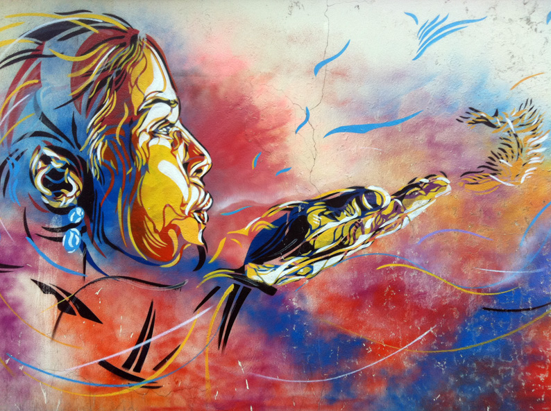 Du côté des grandes tours du quartier Jeanne d’Arc, le trompe l’œil de Folon réalisé en 1985 est une des première grande fresque urbaine dans ce quartier moderne, entièrement restructuré dans les années 1960/1970. Plus récemment, une belle fresque peinte, en hommage à la Pacha Mama a été signée par le collectif chilien Aner/Maher/Alapinta.cl (dans la galerie ci-dessus). Et un collage géant réalisé par Shepard Fairey en juin 2012 redonne des couleurs à une tour située sur le boulevard Vincent Auriol – à voir sur le très beau site un oeil qui traine, sur lequel on peut également découvrir d’autres œuvres de C215 sur les bords de Seine, ou naviguer bien plus loin que le 13e arrondissement de Paris…