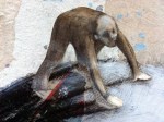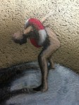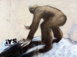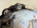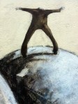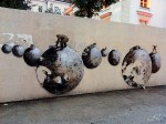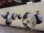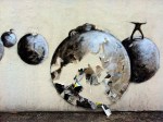 Le mur du Carré Baudoin, côté rue de Ménilmontant à Paris dans le XXe, s’orne de temps en temps d’une œuvre éphémère. Philippe Hérard y a affiché en décembre dernier un collage fait de papiers journaux et de peinture, qui surprend par sa densité, son contraste et sa touche à la fois légère et soignée. L’état de l’œuvre ci-dessus est assez avancé mais cela ne gène pas à sa lecture. Comme une illustration à la surabondance d’informations dont nous sommes enveloppés, des sphères, des micro planètes, sont constituées de coupures de journaux, des articles, sur lesquels des personnages ont bien du mal à trouver chacun leur équilibre ! Le vent et l’eau on décollé un peu les papiers, renforçant l’idée de fragilité de l’ensemble.