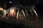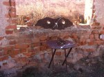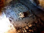 Lisette Orozco et Ivan Medrano sont intervenu dans un petit pavillon à l’entrée de l’hacienda, et ont tiré profit des restes d’un feu pour tracer des curieux signes ésotériques et préhistoriques sur les murs, accrocher un tibia (de mammouth ou quel animal mythologique ?) et disposer au sol un tapis de pierres et de cendres.