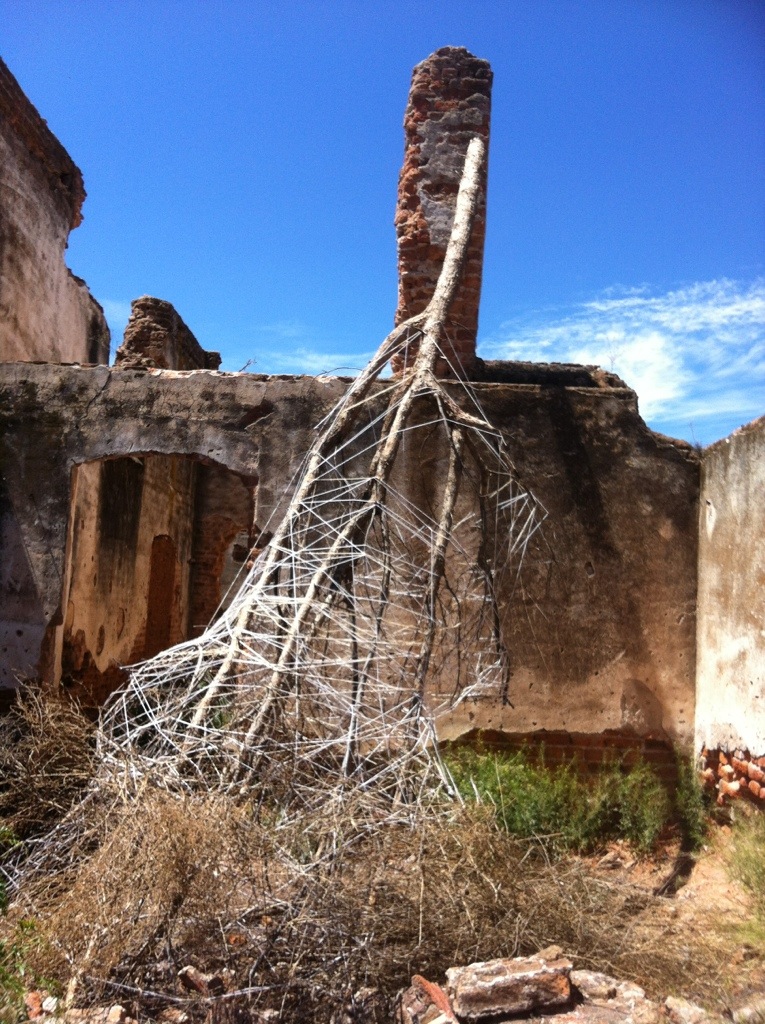 La nueva edición de Arte de la Tierra es una realización-taller de varios artistas que tienen como objetivo ocupar un espacio y realizar allí, en pocos días, esculturas, obras pictóricas e instalaciones in situ. Esta vez, el sitio fue más urbano, después de la extensión inmensa y desértica del estado de San Luis Potosí (leer Arte de la Tierra el desierto). El terreno escogido es una antigua hacienda del siglo XIX, una fábrica de hilos y de tejidos construida en 1830. Abandonada al principio del siglo XX, la hacienda está hoy completamente en ruinas, pero de ella se desprende un encanto increíble. Lugar ideal para el landart, este espacio en el centro de la pequeña municipalidad de La Zacatecana, a algunos kilómetros solamente de la ciudad de Zacatecas, es también el campo privilegiado de los niños del pueblo, un terreno de juego y de aventuras soñado…