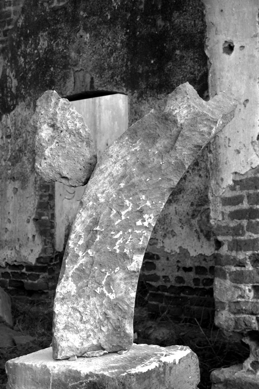 Iván Leaños a choisi d’illustrer la ligne de rupture entre l’occupation et l’abandon d’un espace avec une série de sculpture fabriquées avec des pierres trouvées dans le terrain, et qui jouent avec des équilibres improbables, évoquant à la fois la chute possible et la vie toujours reprenant ses droits dans une friche urbaine.
