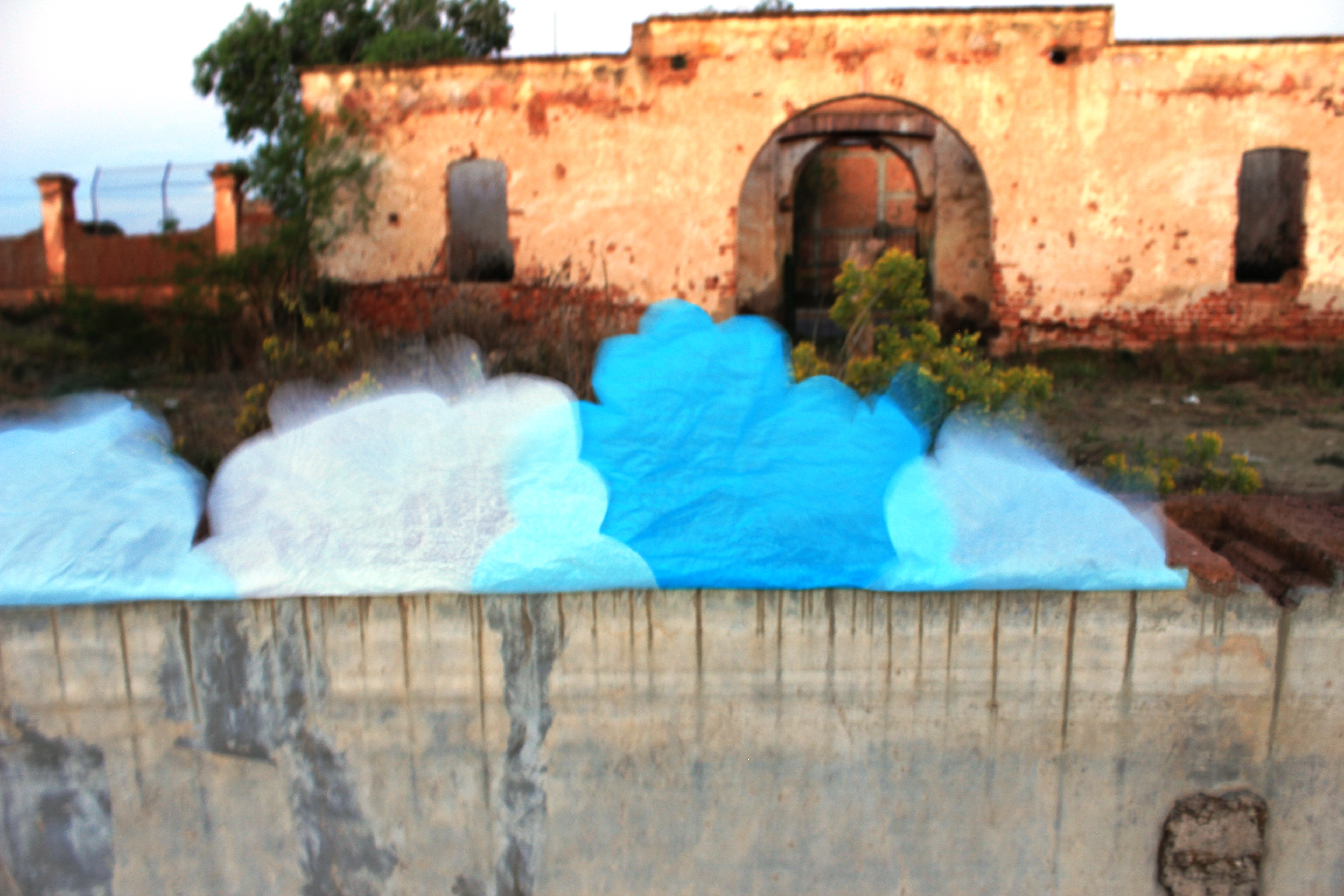 Moi, j’ai jeté mon dévolu sur une grand bassin circulaire, une réserve d’eau aujourd’hui vide. Le ciel de ce week-end était peuplé de gros nuages moutonnants, spectaculaires, qui m’ont tout simplement inspiré. Avec du papier de soie blanc et bleu et un tube de colle, j’ai animé ce bassin d’une famille idéalisée de nuages pas trop sages… qui une fois collés se sont amusés du vent pour onduler et bruisser sans discontinuer. Reflets imaginaires, ils tendaient leurs bras vers leurs cousins réels et recréaient, dans ce cercle de pierre et de béton, l’idée du cycle de l’eau.