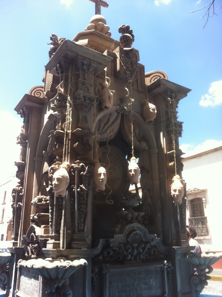Construite en 1946, puis reconstruite à l’identique en 1986, cette fontaine de style pompier fut inaugurée pour rendre hommage aux pionniers des mines de l’État de Zacatecas, et aux fondateurs de la ville du même nom. Zacatecas assura pendant longtemps la plus importante production d’argent au Mexique (alors Nouvelle Espagne) et du Monde entier, durant les deux premiers siècles de la colonie espagnole. Les quatre conquistadors célébrés ici sont Juan de Tolosa, Cristobal de Oñate, Baltasar Temiño de Bañuelos et Diego de Ibarra. Le premier fut le capitaine de l’expédition de 1546, grace à laquelle furent découverts et exploités les filons d’argent. Le second participa également à l’expédition, et posa en 1547 la première pierre de la future ville de Zacatecas, qui allait se couvrir de palais somptueux et d’églises baroques. Le troisième obtint quarante ans plus tard la reconnaissance officielle de la ville par la Couronne d’Espagne – le roi Felippe II en 1485 puis en1488 – avec le titre de Muy Noble y Muy Leal Ciudad et l’attribution de son blason (voir Labor omnia vincit improbus). Enfin le quatrième fut un mineur richissime et soit-disant généreux du XVIe siècle.